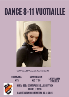 Kevätkauden 2026 aikataulut ovat valmiina! 4.12.2025 https://www.leppavaaransisu.fi/harrasteliikunta-ryhmaliikunta/kevaan-2026-aikataulut/ |