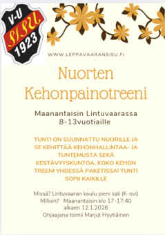 Kevätkauden 2026 aikataulut ovat valmiina! 4.12.2025 https://www.leppavaaransisu.fi/harrasteliikunta-ryhmaliikunta/kevaan-2026-aikataulut/ |